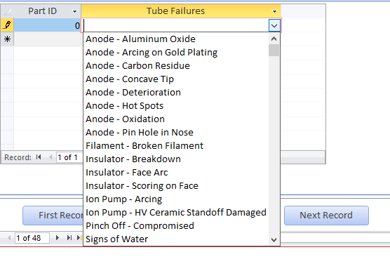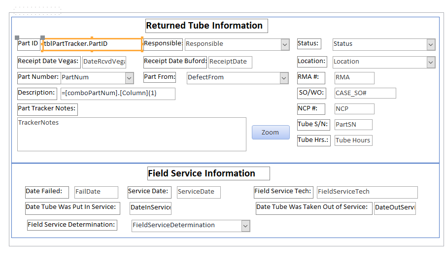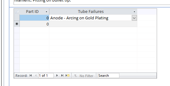 I tried making a table relationship between the PartTracker table and the TubeFails table in the subform query, but did not work for me. The SQL for the query is: