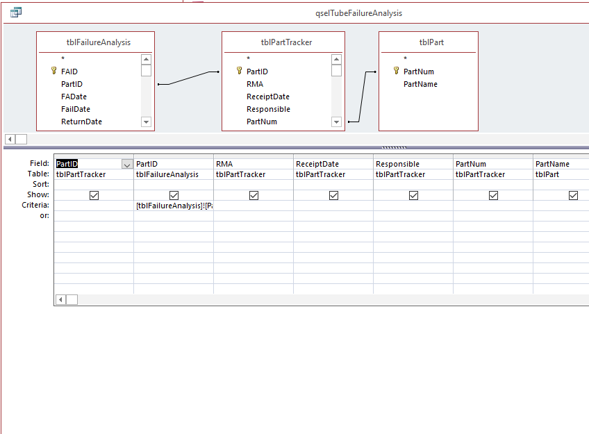 FROM (tblFailureAnalysis INNER JOIN tblPartTracker ON tblFailureAnalysis.PartID = tblPartTracker.PartID) INNER JOIN tblPart ON tblPartTracker.PartNum = tblPart.PartNum