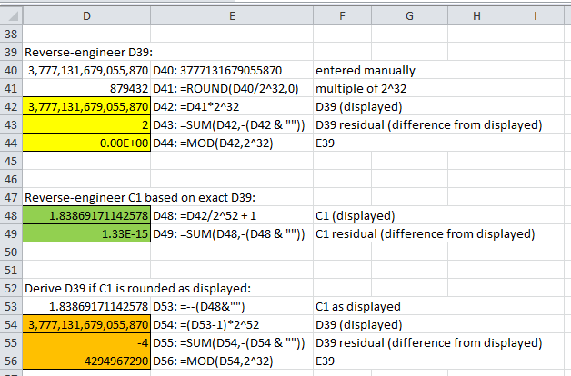 vbNewLine & "D39: " & "(C1-1)*2^52 = " & Format(d39, "0") & sD39 & _