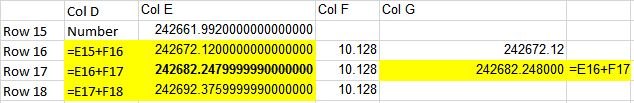 I created a series of numbers by adding +10.128 to the cell on the row above!