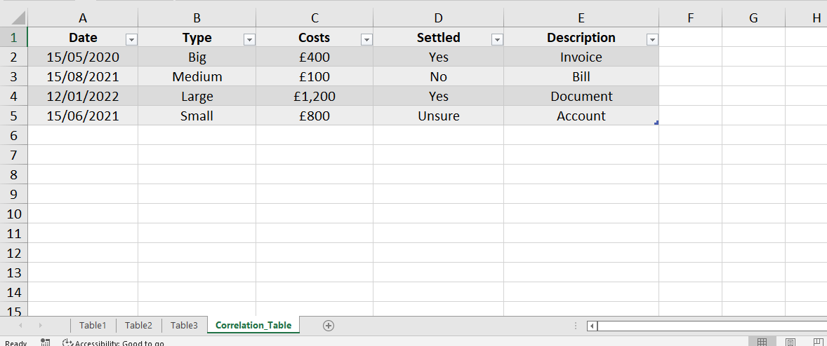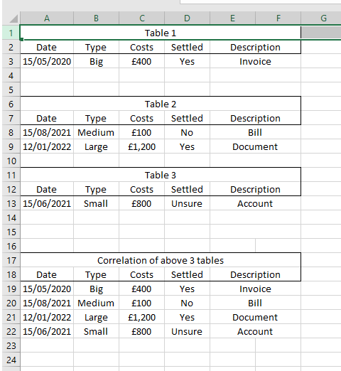 There will never be line spaces within table 1, 2 and 3 (so for example if there is only 1 line in table 1, it will always be the first one, if there are two lines, it will always be the first two lines etc...).