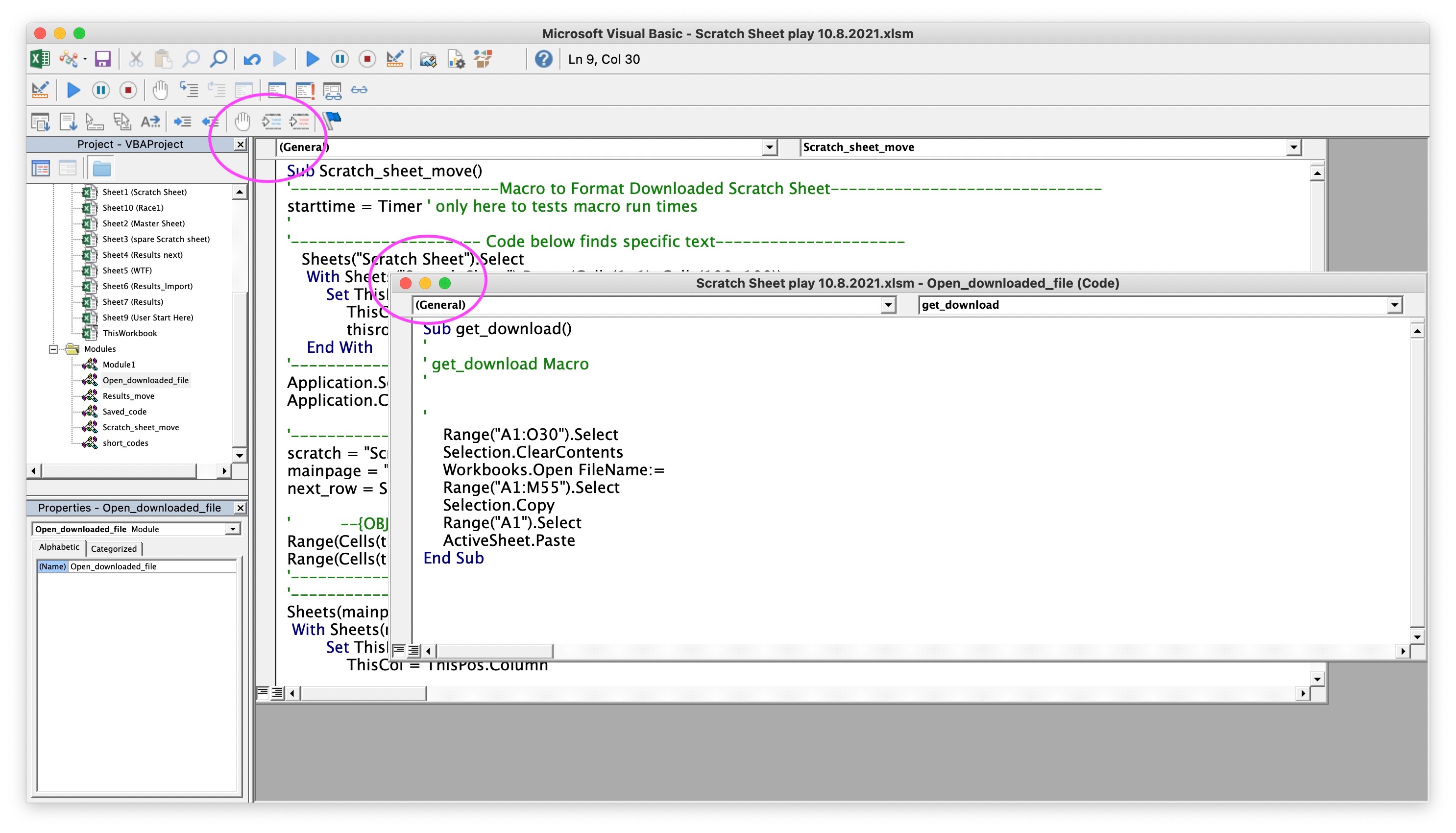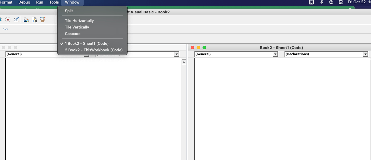 Thanks for the updates, However, I cannot repro the same issue on my side in Excel, but I would suggest you try tile windows in VB editor by Window button at top menu>Tile Vertically and you can view the window side by side. If you can not see toolbar of the window, you may also click Tile Vertically and check if you can see the toolbar again.