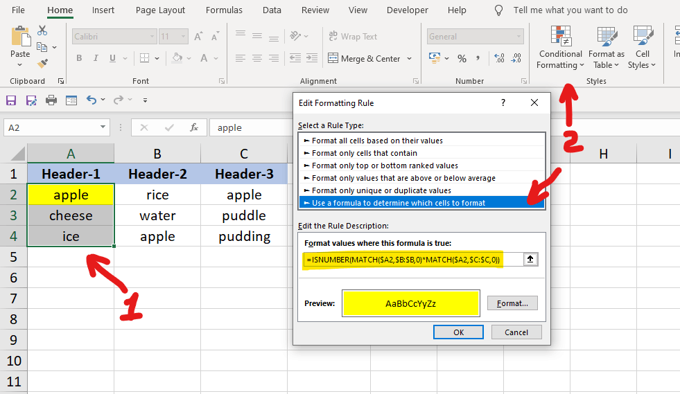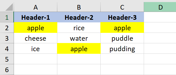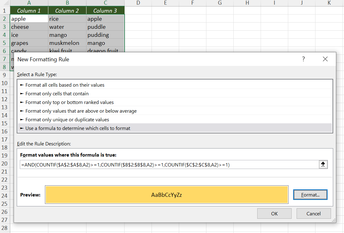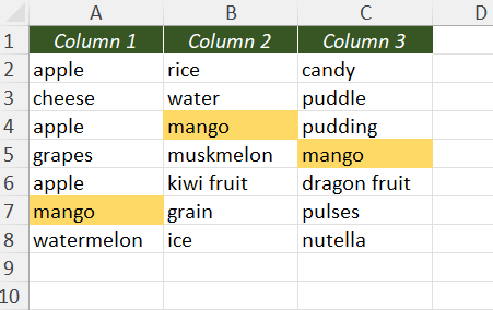 Result - Now, because only mango appears in all 3 columns, all mangoes are highlighted.