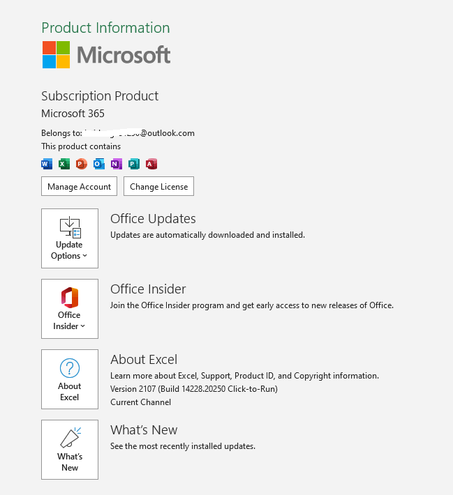 In this scenario, please ensure your Microsoft 365 apps are fully updated. To check version information, open any Office app, such as Excel or Word, click File>Account, check for the info mentioned under Product Information. The latest version of Current channel is 2107 (Build 14228.20250). For other channel version info, see Update history for Microsoft 365 Apps (listed by date)