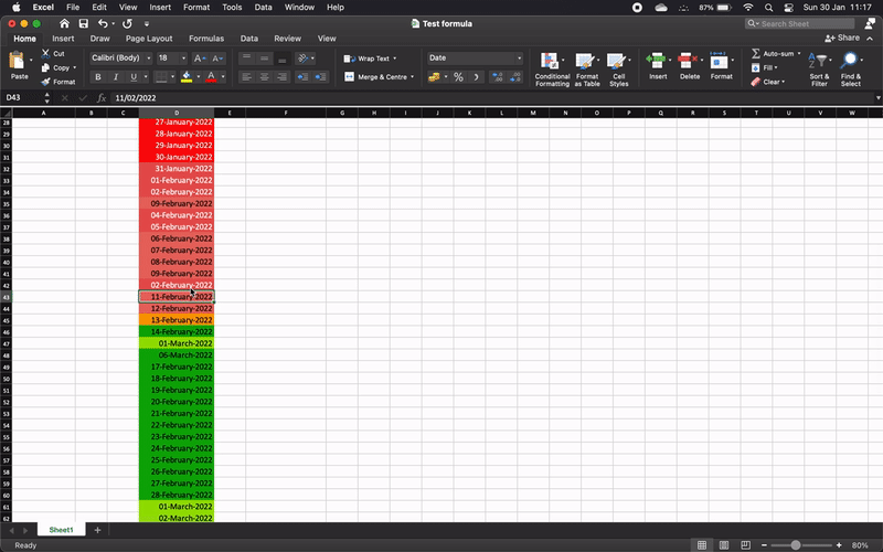 Date Conditional Formatting changing colour based on date below (Excel - MacOS)