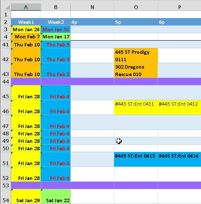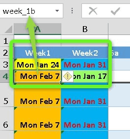 So I edit formula A45 to change from = -1 + Week_1A +5 to = -1 + Week_1B +5