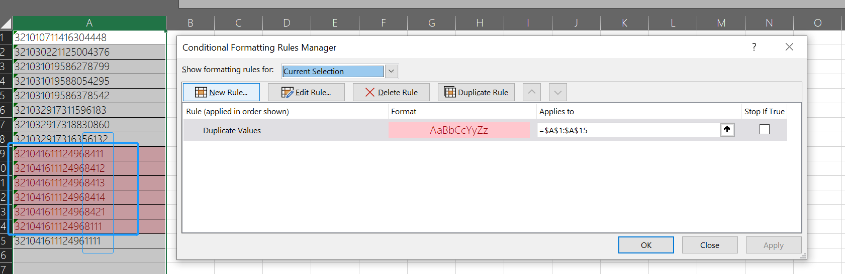 The function "conditional format --> duplicate values " can't recognize the number(stored as text) larger than 14 digits. If the text length is longer than 14, and the former 14 byte is same while the left is different, the function will only judge the first 14 byte, and give the conclusion that the data are same.