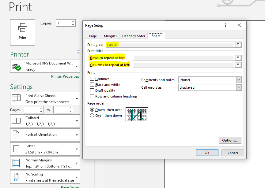 Print area, Rows to repeat at top, columns to repeat at left [Unable to Select in Excel 365]