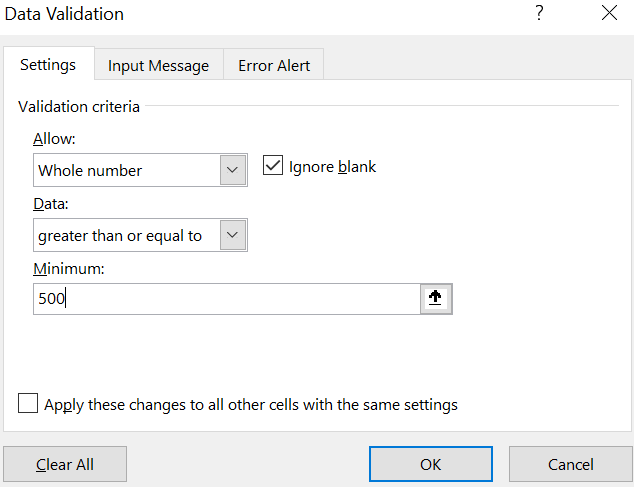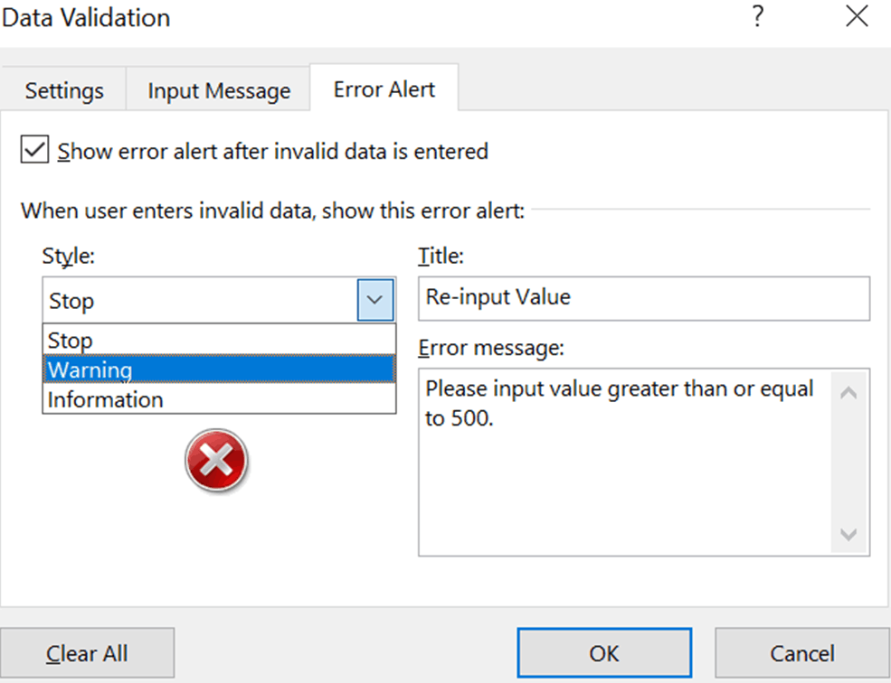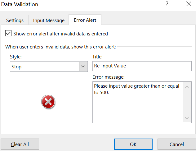 2. Under **** Error Alert tab > You may customize the message that will appear if the User inputs value less than 500.