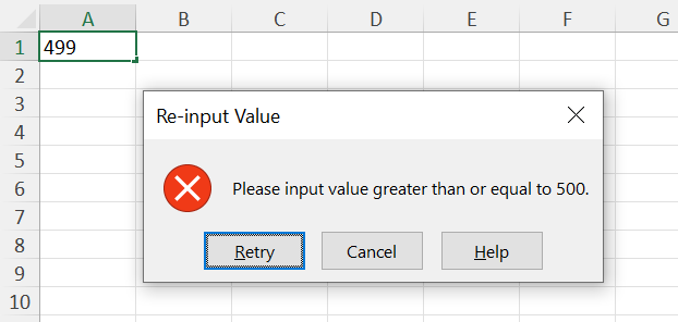 Warning: Above solution can be by-passed if the User pastes 499 or a lesser value on the cell where Data Validation was applied.