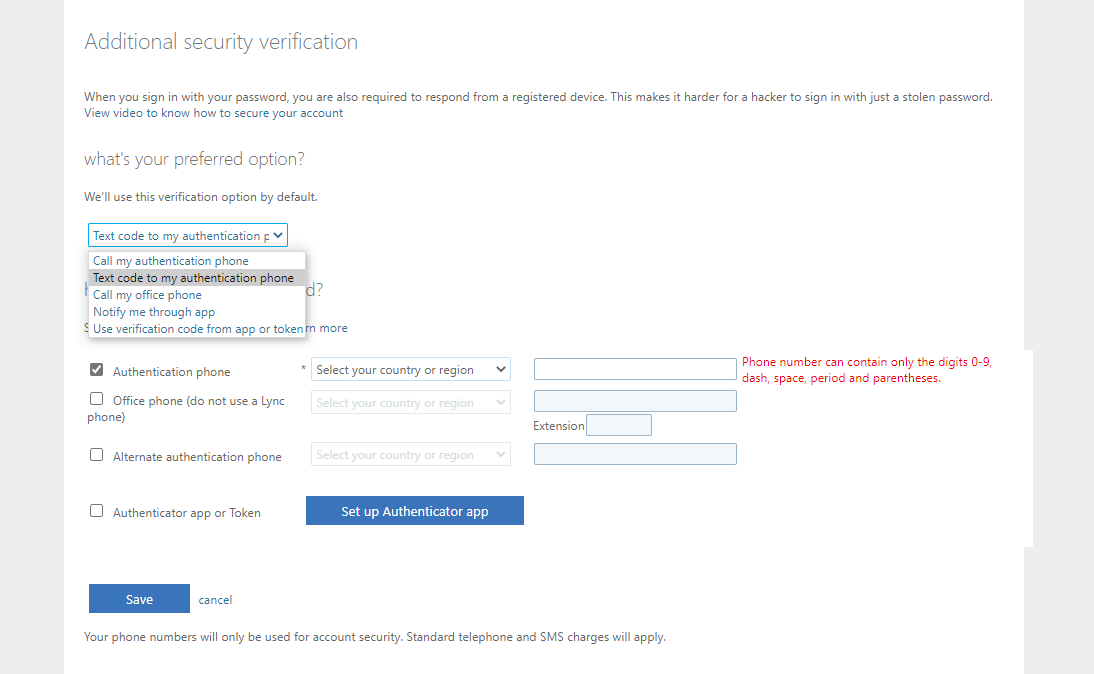 "From the Additional security verification page, select the method to use from the What's your preferred option list. You'll see all of the options, but you can select only the ones that are made available to you by your organization."