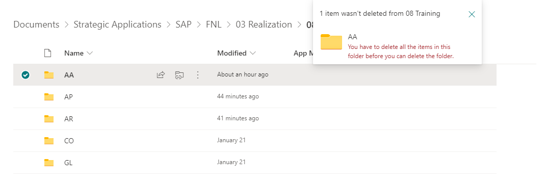 Per my search, the error message "You have to delete all the items in this folder before you can delete the folder" may be related to the site/library which is on hold.