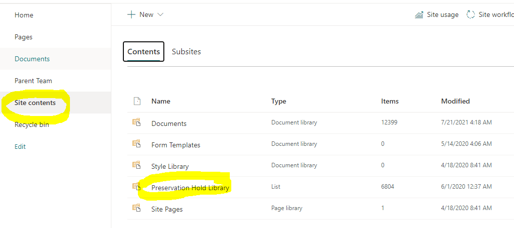 (https://yourtenant.sharepoint.com/sites/sitename/_layouts/15/viewlsts.aspx?view=14) and see if there is a library called Preservation hold library.