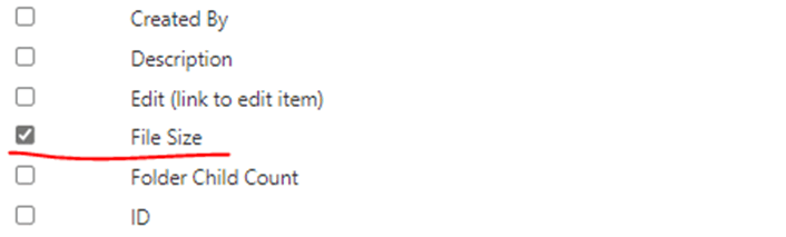 Open your SharePoint document library > All Documents > Edit current view > tick the box next to File Size > OK