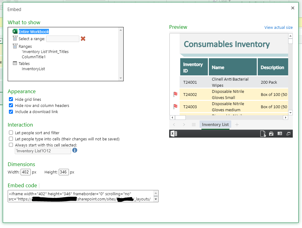 According to this article: Embed your Excel workbook on your web page or blog from SharePoint or OneDrive for Business - Office Support (microsoft.com)