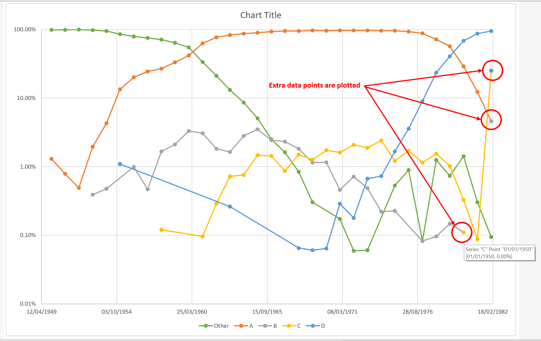 I can not reproduce the issue, when I recreate the chart based on your data I can see this data points too, but they are correct! Your data shows this values in the last row, e.g. for 2 values: