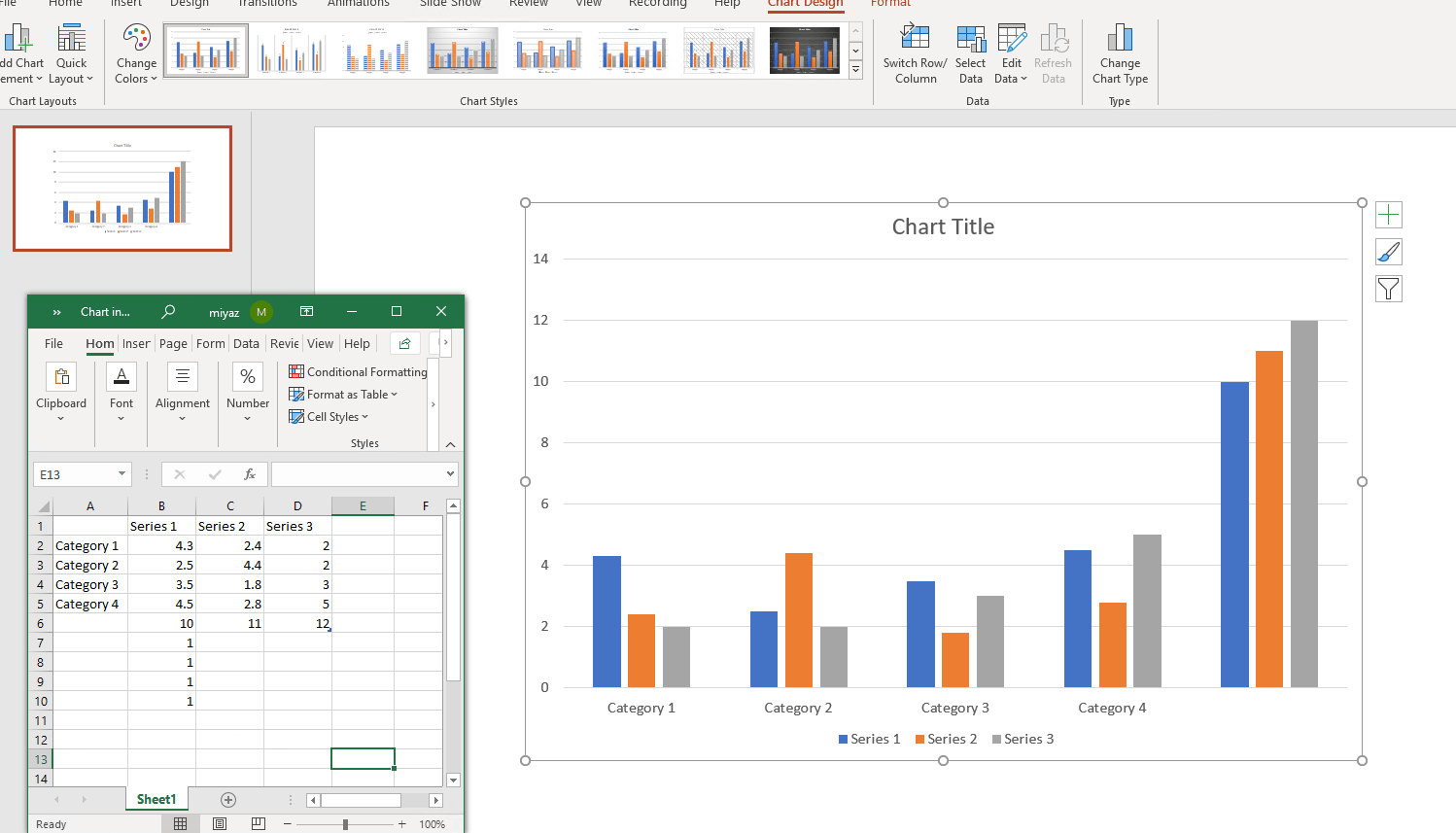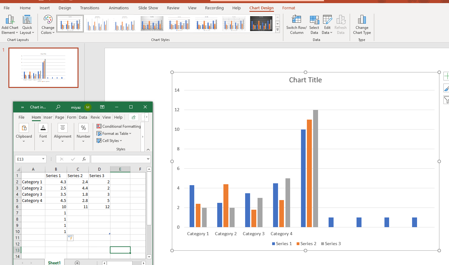 3.Based on my tests just now, the moment I entered data in the worksheet, it will immediately show on the chart in PPT. Hence, please share back if the added data will immediately make the change on the chart. Also, we need the screenshot about the workbook when you click 'Edit Data in Excel' similar as the attached one.