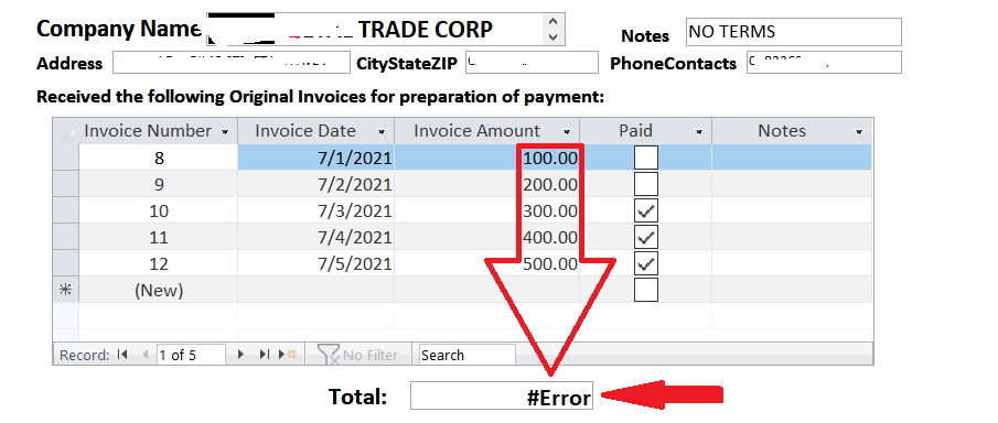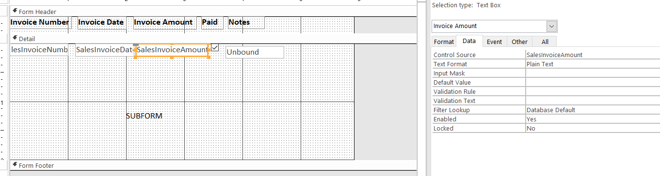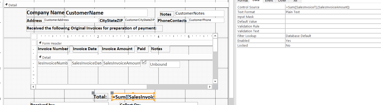 Set the Control Source of this text box to =Sum([SalesInvoiceAmount]) and set its Visible property to No.