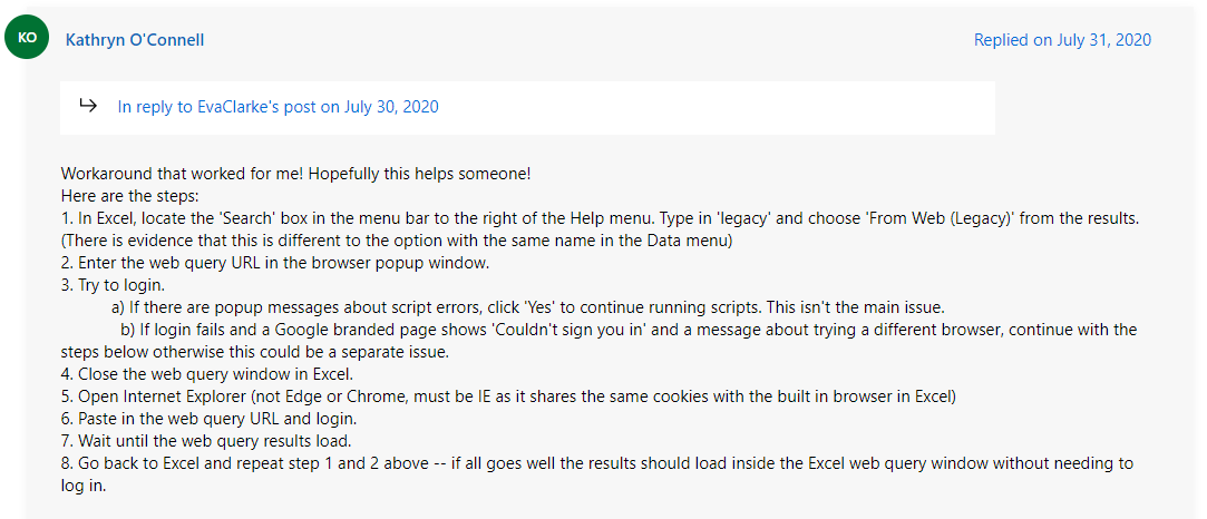 Since you mentioned, " I followed the direction and logged in to SA360 in Microsoft Edge and load the query with no problem. Went back to excel to refresh the web query but it didn't resolve the problem." may I know does issue happened do specific Excel document? If the issue happens to all Excel files including a new created one, the issue is more related to the Office app itself or your computer environment.