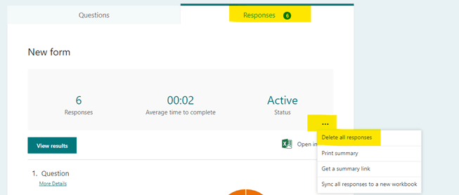 May I know if my understanding is right? If so, if you just want to delete the responses in Microsoft form daily, you can go to Microsoft Forms > click Reponses > click Ellipsis > Delete All responses, as shown below: