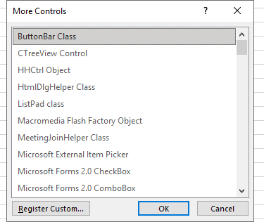 If my understanding is right, we have also tested it on our side with the latest version of current channel in Excel, we just installed 64 bit Microsoft 365 Business, and we found we also cannot find this control under ActiveX control, as shown below: