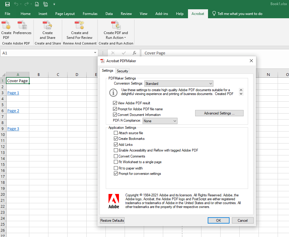 Since you mentioned you have the Adobe Acrobat Pro installed, do you see the Acrobat tab in your ribbon? If so, then click on it, click on "Preferences" and make sure to uncheck the option "Enable Accessibility and Reflow with tagged Adobe PDF". Restart excel then try using Adobe's create PDF function in Excel and verify the result. Let me know if this works.