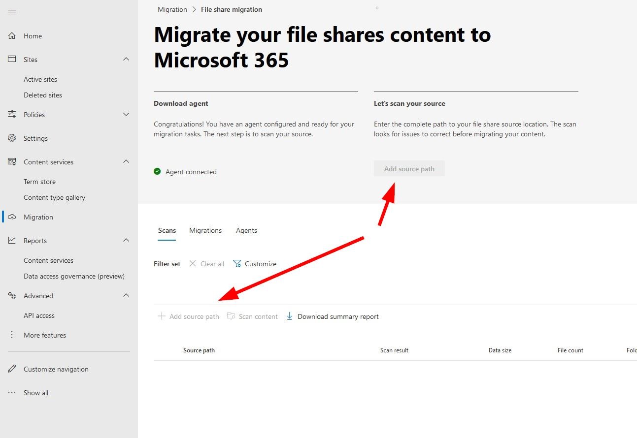 According to your screenshot, I assume you have run agentsetup.exe, connected to tenant in Microsoft 365 Migration. You can view the agent under the Agents tab. Based on the reference and my test, after the agent is configured, please check if you can add source path to scan. If not, please create the task under the Migrations tab, then try to add source path to scan.