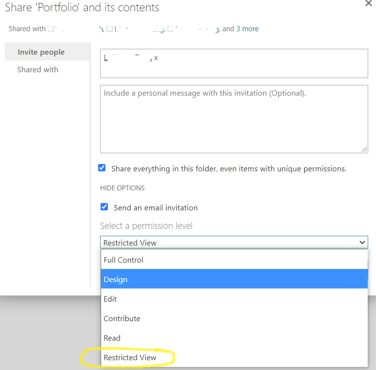 At the same time, for new SharePoint site, Restricted view permission will not appear, Restricted view is not a built-in permission level. It shall be a custom one and being deleted by another user in that site. So we’d still suggest you use the suggestion we provided above to create a new permission level, this is the best way to achieve your requirement.