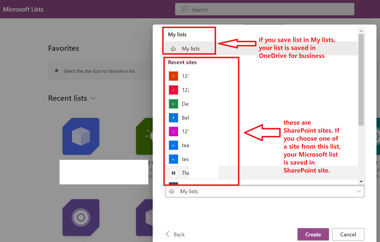 For troubleshooting, may I confirm that when you create new Microsoft Lists, where do you store the new lists? In My Lists or SharePoint sites?
