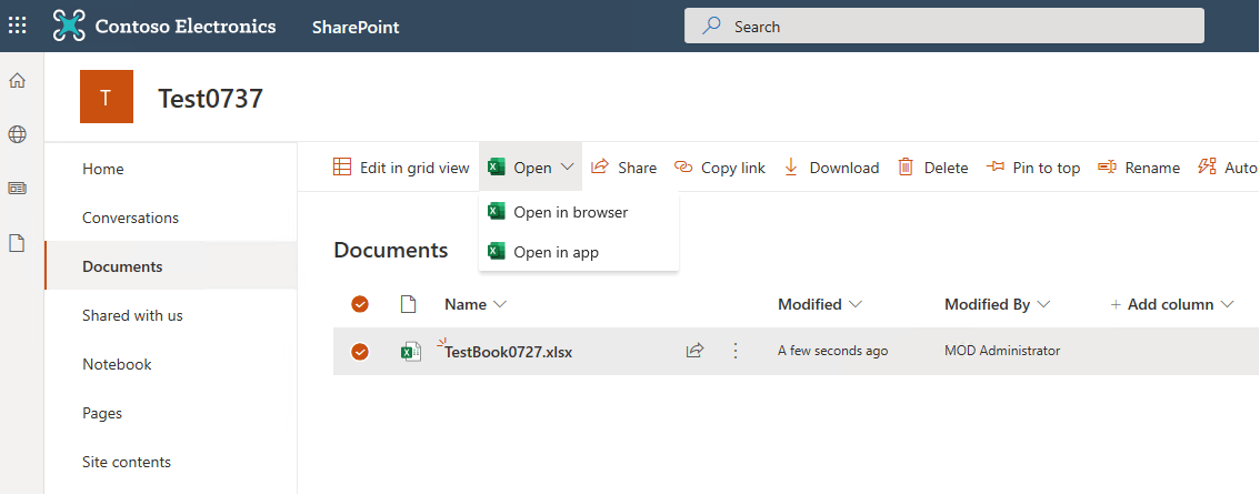 2.Site member Mia Gray opened this workbook in local Excel app and clicked Check out to be able to edit the workbook locally.