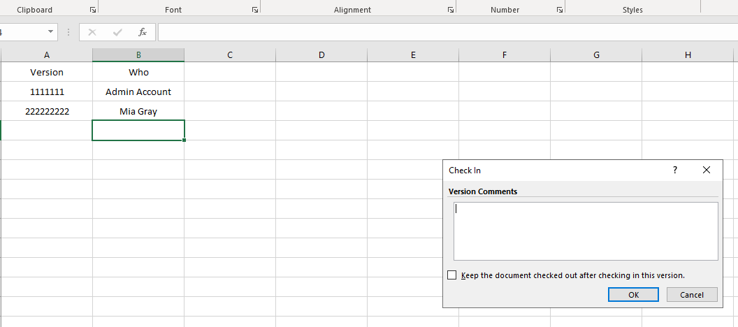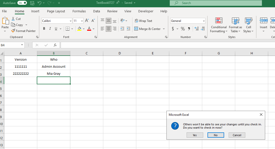 3.Mia Gray edited the workbook normally. When the workbook is synced and clicked close button, Excel will pop out a box saying Do you want to check in. When clicked Yes, it will ask for version comments. Please note, do NOT click on Keep the document checked out after checking in this version.