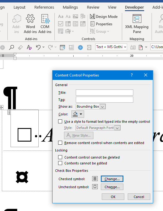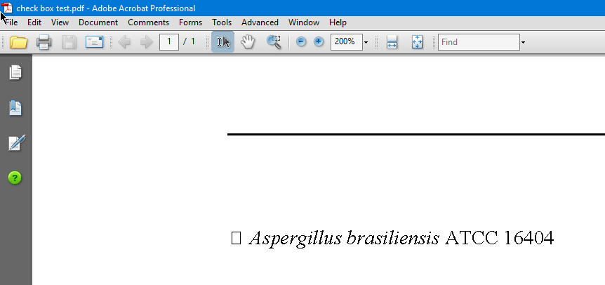 The "checkbox" is visible in the output created by printing the document to a pdf file using the Microsoft Print to PDF facility