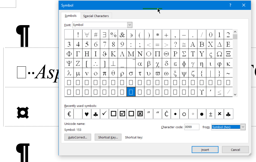 However, you appear to be using Symbol (Hex) character 0099 for the "checkbox", which I believe is an "empty" character
