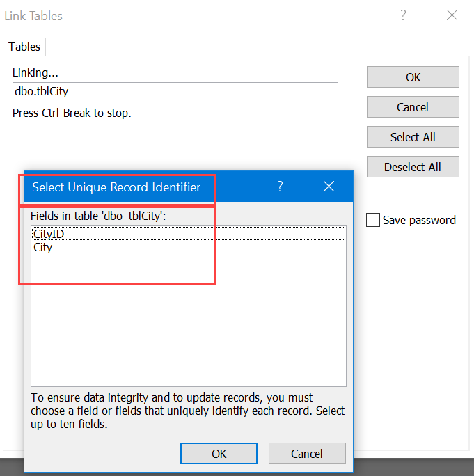 You have an Oracle database, which I haven't used for a long time and don't recall specifically. So this may or may not be useful. When you initially link to the tables in the Oracle database, do you see a dialog like this? It appears when Access can't determine the Primary Key. In this case, CityID WOULD be the PK, but it's not designated as such. Perhaps you need to select the field or combination fields that make up the PK in these tables.