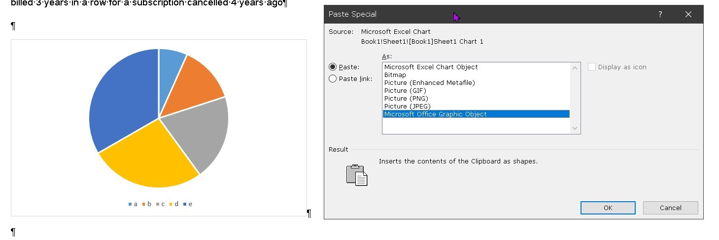 2021-11-15T14:08:54+00:00 If you want to go really low-tech, use a snipping tool to screenshot the chart and paste it in as an image. It will not be able to update link but it is 100% effective. I use this method to move Excel charts into Google Slides or when Excel is being difficult.