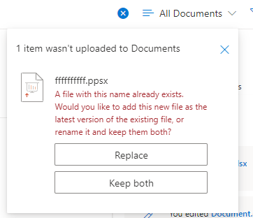 May I know if my understanding is right? If so, we have also tested it on our side, we went to SharePoint Document library and uploaded a file, then we uploaded again the same file, we encountered the error message, as shown below: