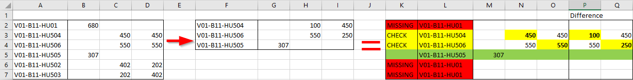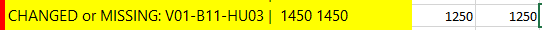 =IF(COUNTIFS(F:F;A2;G:G;B2;H:H;C2;I:I;D2)=0;"CHANGED or MISSING: "&A2 &" "& B2 &" "& C2 &" "& D2;A2 &" "& B2 &" "& C2 &" "& D2)
