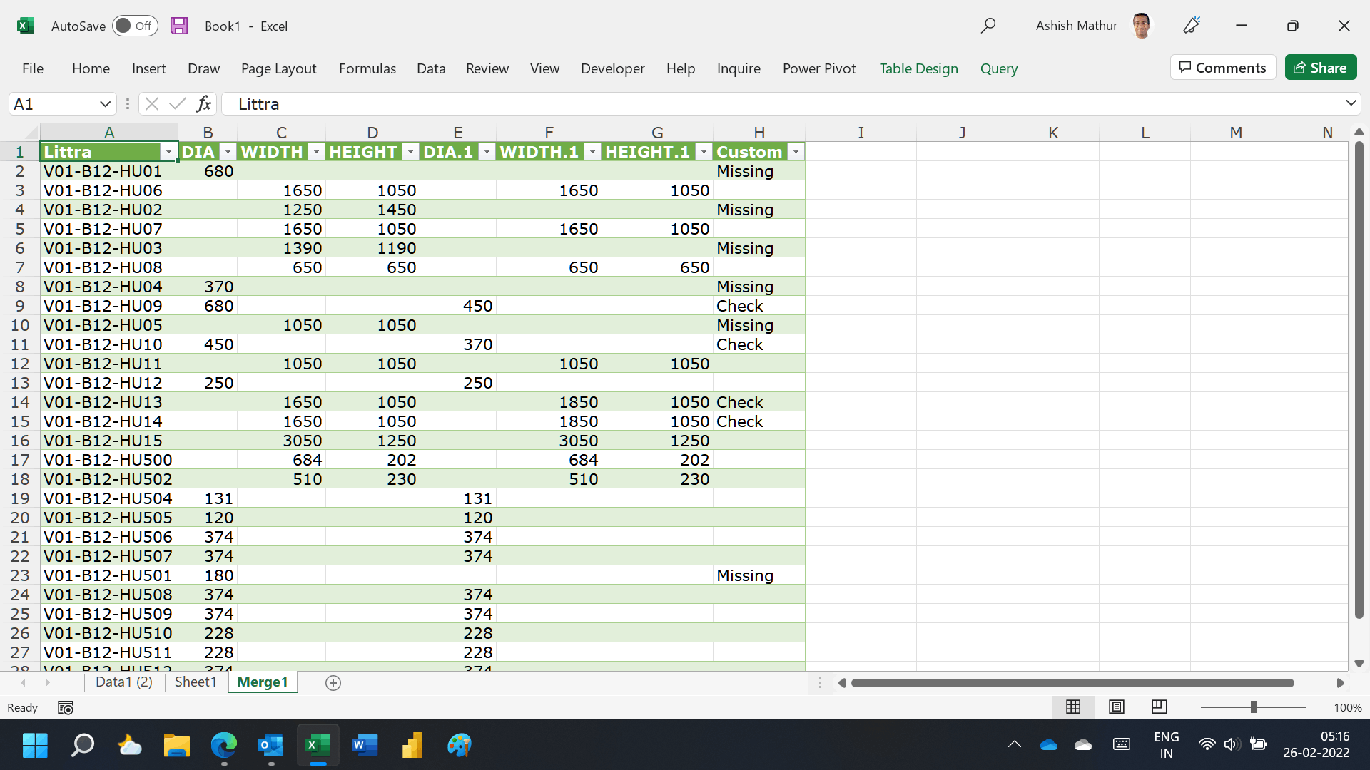 =IF(COUNTIFS(F:F;A2;G:G;B2;H:H;C2;I:I;D2)=0;"CHANGED or MISSING: "&A2 &" "& B2 &" "& C2 &" "& D2;A2 &" "& B2 &" "& C2 &" "& D2)