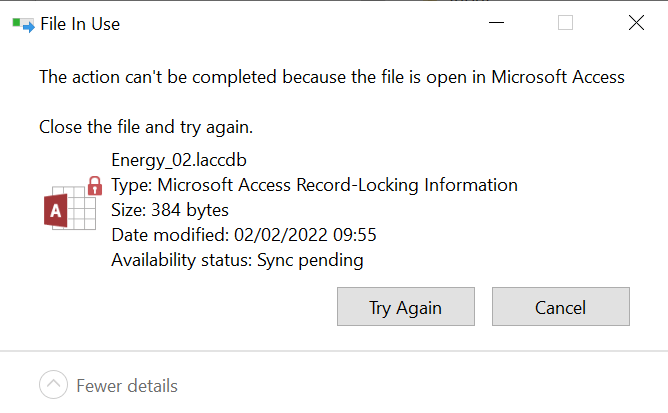 I also notice that the lock files are trying to synch (with OneDrive?) and cannot be deleted - I get the message below: