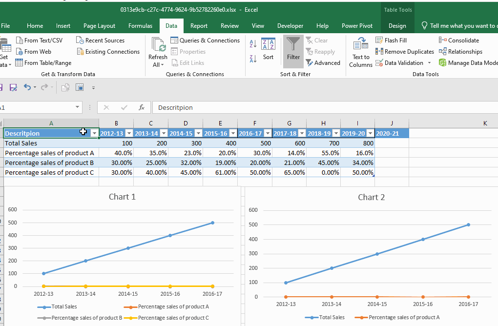 I want my charts updated automatically each time when I add a new column. I have converted the data into a table, also defined the names of the row. However the 2nd chart isn’t updating automatically as I wanted. This chart select the total sales row and the percentage calculation row. Here is my testing file if anyone can help me. Thank you
