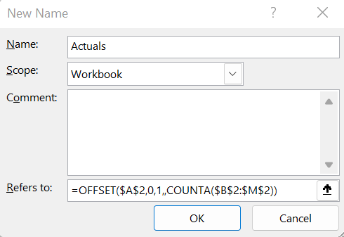 You can test the formula in a blank area of the spreadsheet and then copy it into the Refers to line of the box above. If you return the the Name Manager you will see that Excel has added the sheet name to the formula: =OFFSET(Sheet1!$A$2,0,1,,COUNTA(Sheet1!$B$2:$M$2))