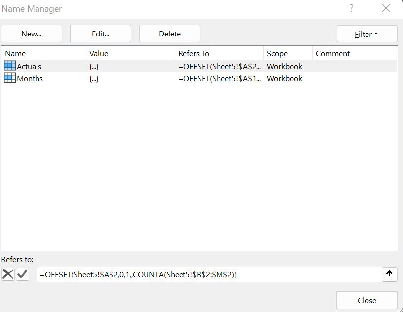 You can test the formula in a blank area of the spreadsheet and then copy it into the Refers to line of the box above. If you return the the Name Manager you will see that Excel has added the sheet name to the formula: =OFFSET(Sheet1!$A$2,0,1,,COUNTA(Sheet1!$B$2:$M$2))