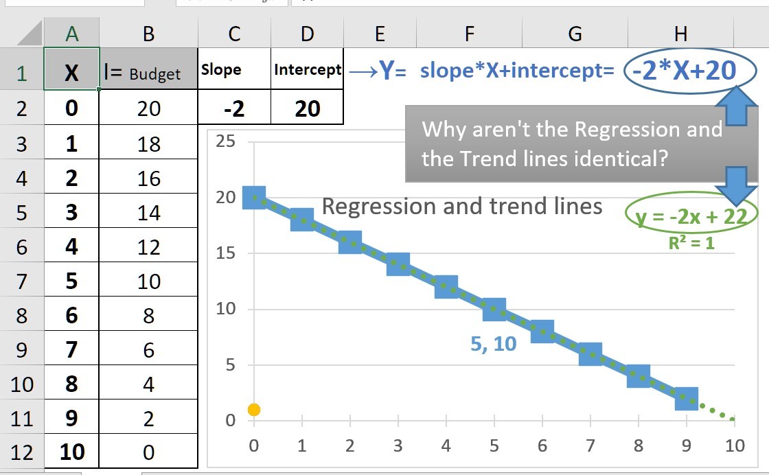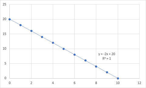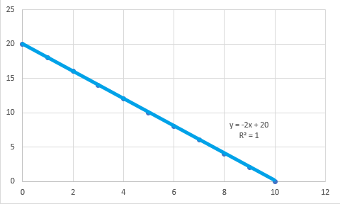 On the other hand, the trend line which follows the graph by 100%, with R^2=1, presents a diferent formula of Y=-2X+22, which does not suit the coordinates like (5,10) though by the graph it looks as if it does.