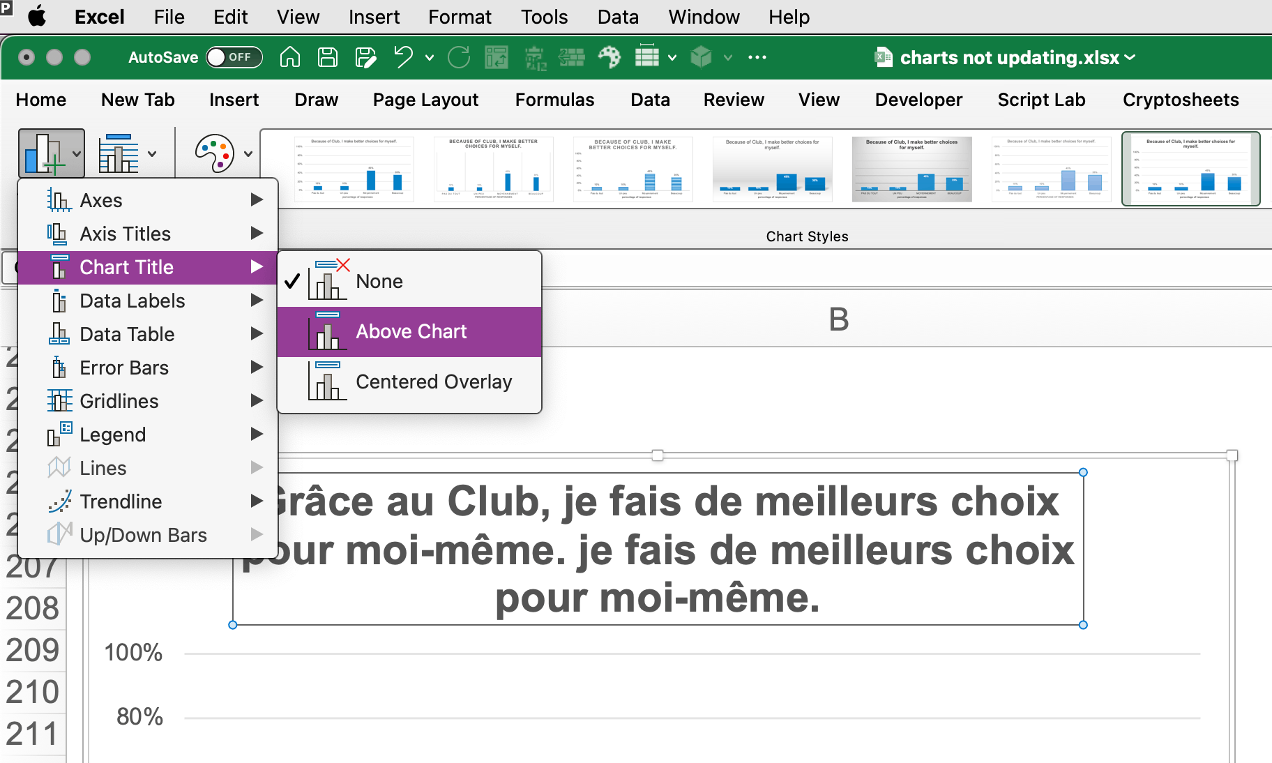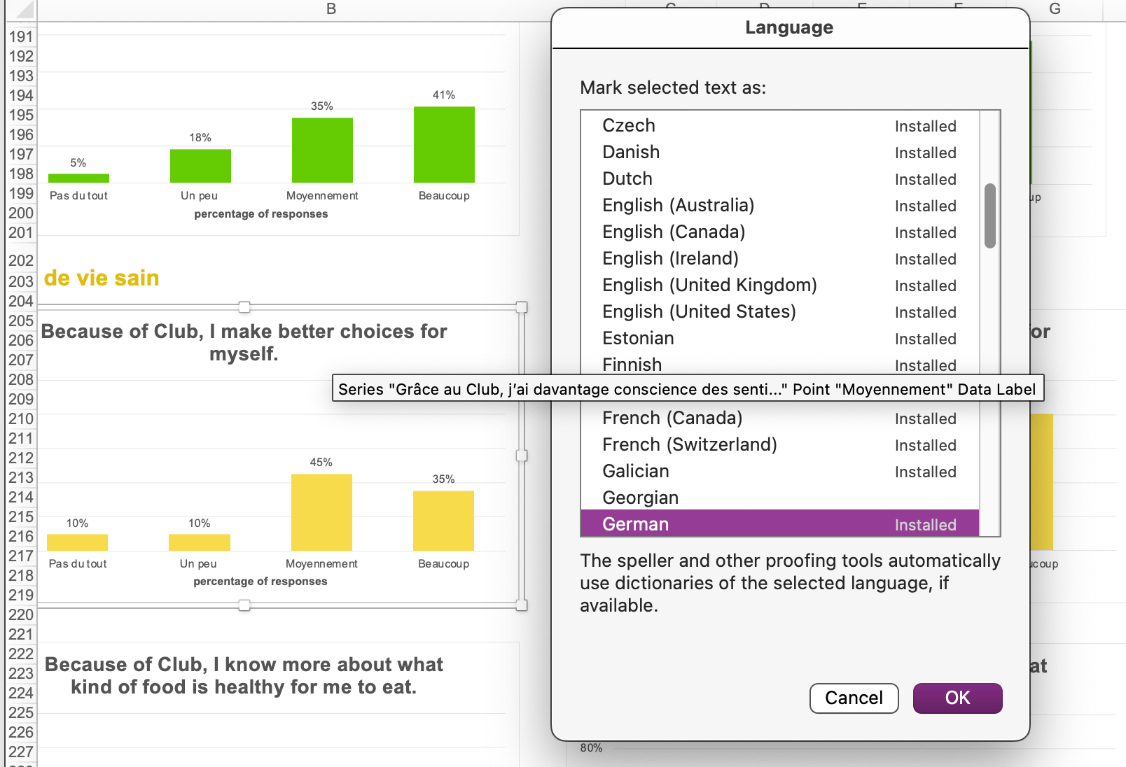 I really appreciate you looking through my file so carefully! It's interesting to hear that you don't see any English titles. For me, the charts from rows 205-308 on the first sheet (Toutes les reponses...) are showing what is in the screenshot below. Somehow, all the charts on the other tabs updated just fine.