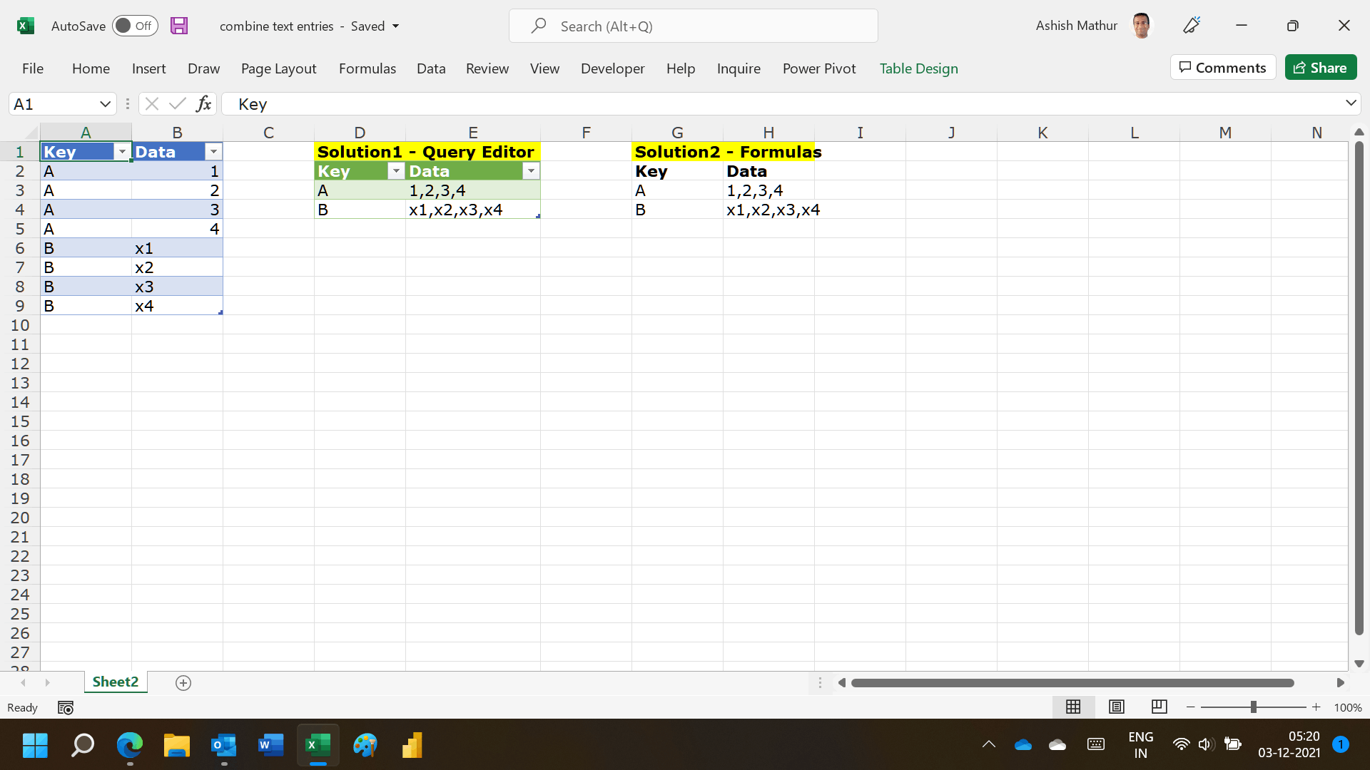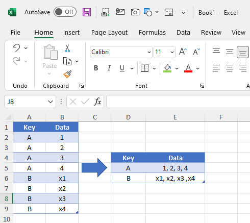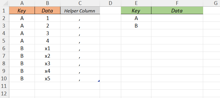 =TEXTJOIN(", ",TRUE,IF(Table1[Key]=D5,Table1[Data],""))