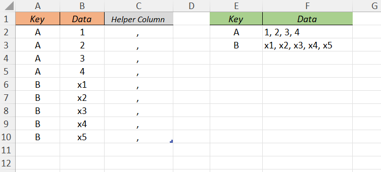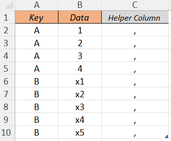 -- In cell C2, please write the following formula: **** =IF(COUNTIF($A$2:A2,[@Key])=MAX(COUNTIF([Key],[@Key])),"",", ")