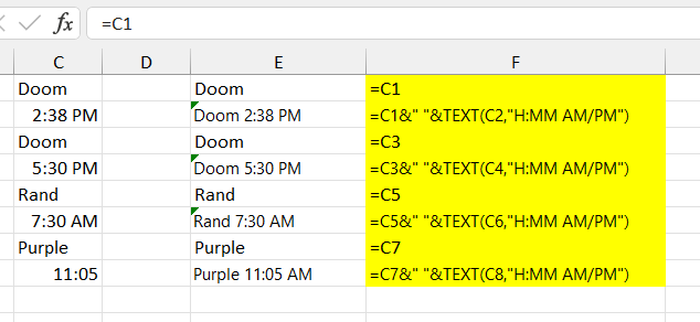 If your data is in groups of two as in Column C above, you could enter formulas in any column as in Column E above (formulas written out in Column F) to put the data in a separate column and hide the original column. Or, if you need the layout to follow a particular look, these formulas could be put on a separate sheet in Column C giving you the same appearance as if the two pieces of data had been combined in C2, C4, C6, etc.