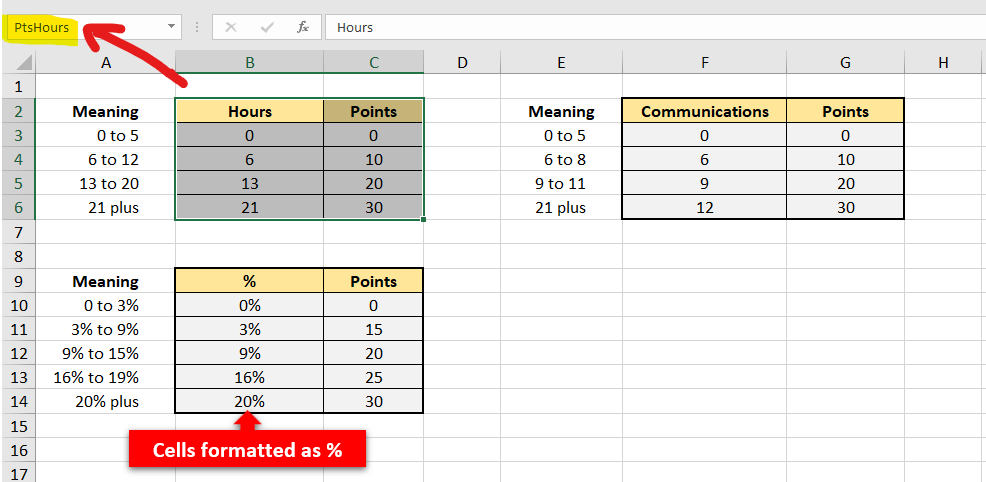 - On a new sheet (recommended) create 3 tables as in the picture below and give them a meaningful Named Range