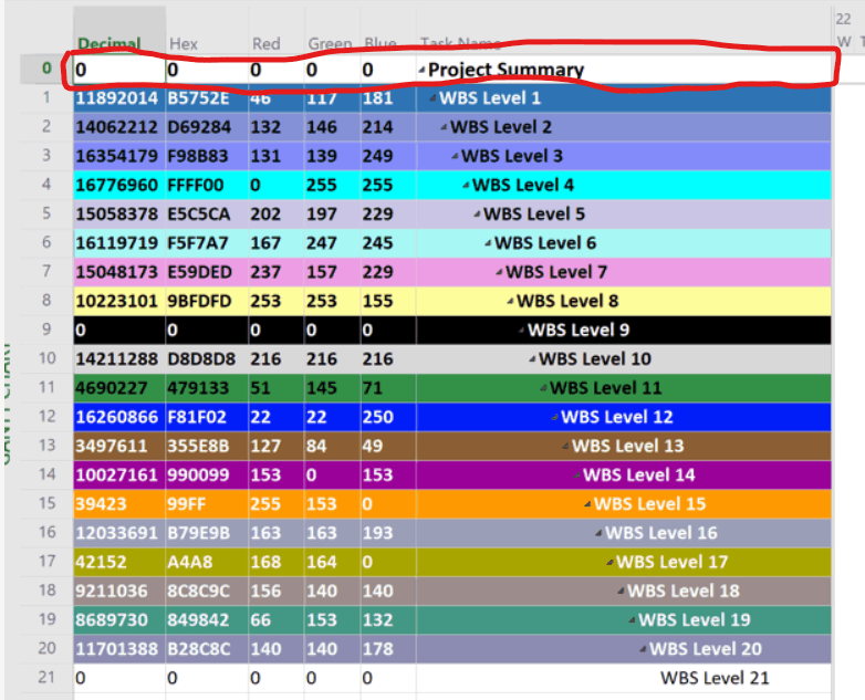 Now, how about answering my question. Let me even re-state it to be more clear. Should the current color scheme be shifted up one level such that, for example, the current color (R46, G117, B181) for WBS Level 1 be used for the Project Summary Task and all other colors shifted up one row? If not, then I don't know what you want.