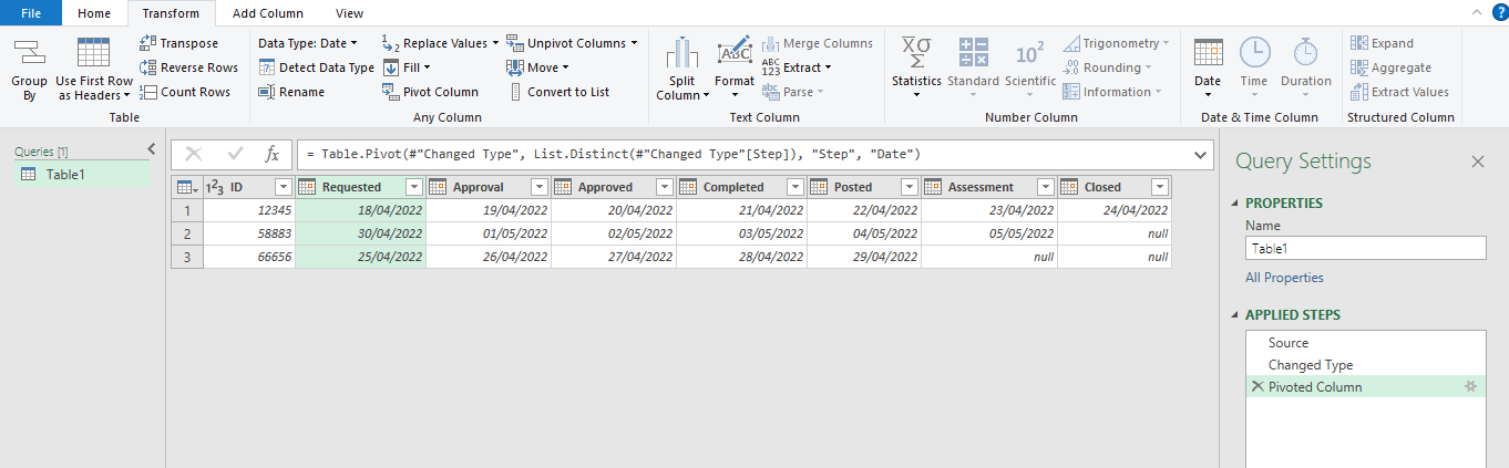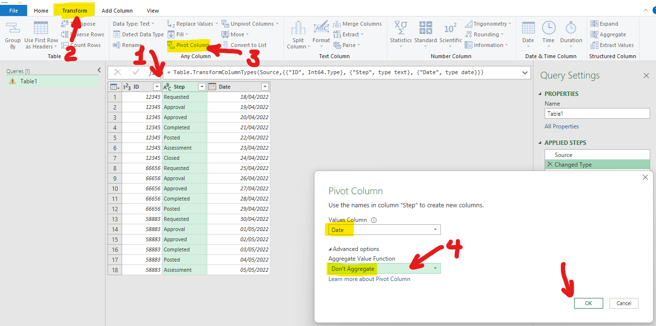 - On the Pivot Column window select "Date" as the Value column. On the Advanced Options select "Don't aggregate" from the dropdown and click OK